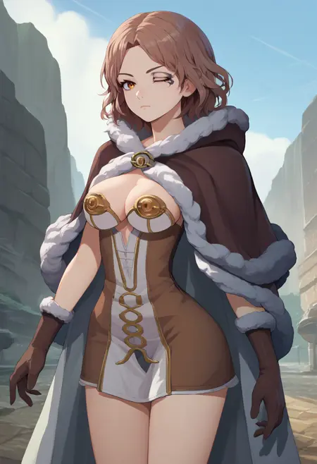 触发词 + 额外标签: ragnarokhiwiz, 毛皮镶边, 棕色斗篷, 毛皮镶边斗篷, 短裙, 双色裙, 白色裙子, 棕色裙子, 无肩带裙, 棕色手套, 毛皮镶边手套