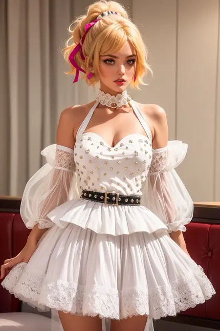 これはかなり変わっている。外付けの袖とチュールスカートを持つ、激しくスタッドが施された白いペプラムドレスだ。ハローネックにするか否かは、あなたの運次第で、厄介なリボンが絡んでいる。チョーカーを省略すると、それが現れにくくなる可能性がある。要素は距離によって顔を隠すことがあるので、それに応じて強調しよう。