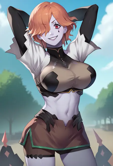 Trigger + Appearance: ragnarokhunter, white jacket, brown shirt, crop top, short sleeves, elbow gloves, fingerless gloves, brown skirt, miniskirt, shorts under skirt, brown shorts, bike shorts, midriff