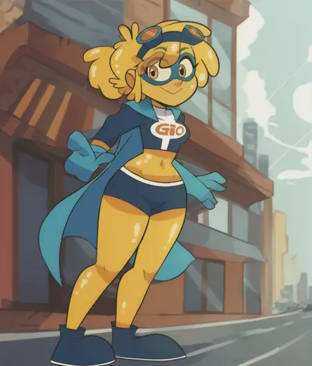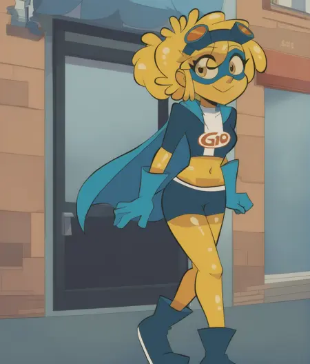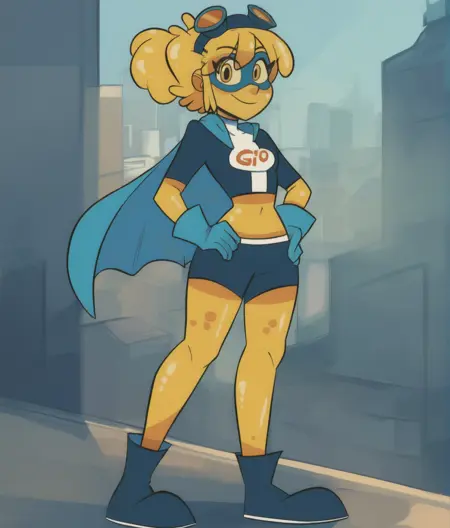 ssuperhero costume, shirt, short cape, round goggles, domino mask, white turtleneck, blue shorts, shorts, blue gloves, blue domino mask, blue cape, g-lo, orange text "g-lo" on topwear, white waistline, blue topwear, white pattern on topwear, glo topwear, navel: hero costume