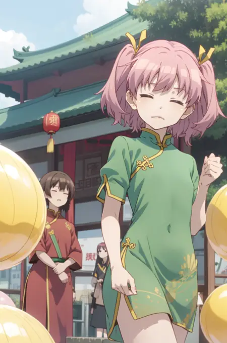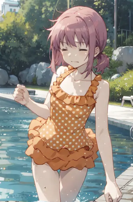 ショートヘア、水着、サイドロックス、フリル、ワンピース水着、ポカドット、カジュアルワンピース水着、フリル付き水着、ポカドット水着