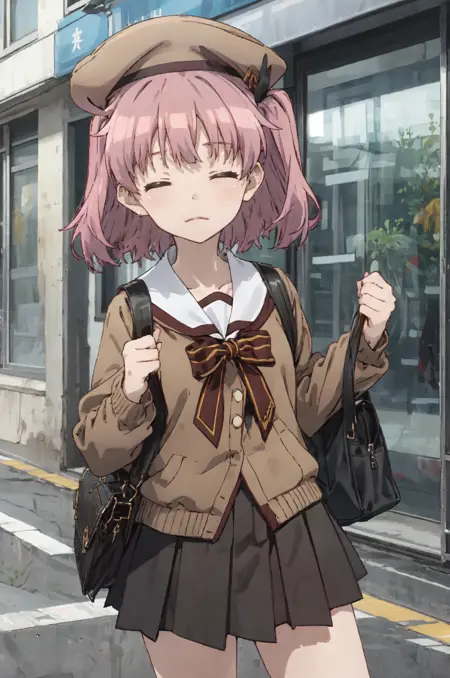 学校:前髪、シャツ、帽子、学ラン、セーラー服、ベレー帽、バックパック、茶色の頭部装飾、スカート、長袖、リボン、プリーツスカート、黒いスカート、バッグ、両側アップ、茶色のジャケット、茶色の頭部装飾、茶色のシャツ、黒い縁取り、持ち手、 Homurahara 学園制服
