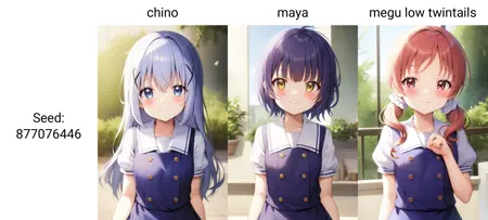 Trigger Words: chino | maya | megu. They can be used together for latent couple pictures. For Megu, adding low twintails helps getting her hairstyle.