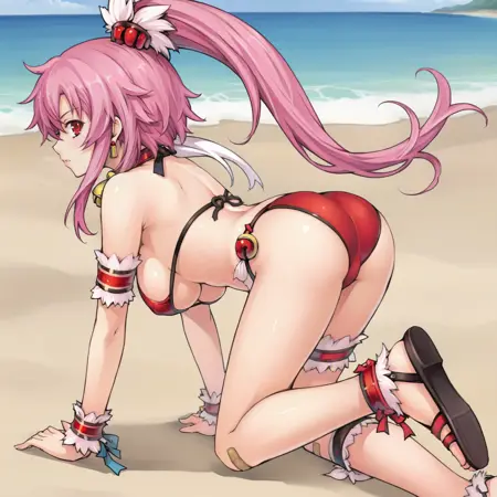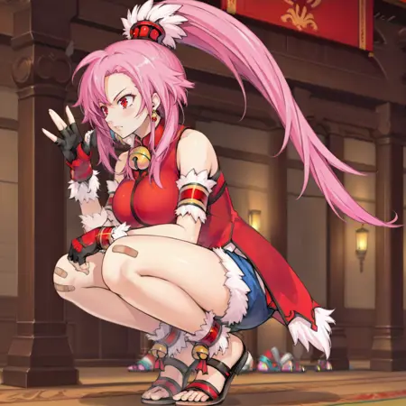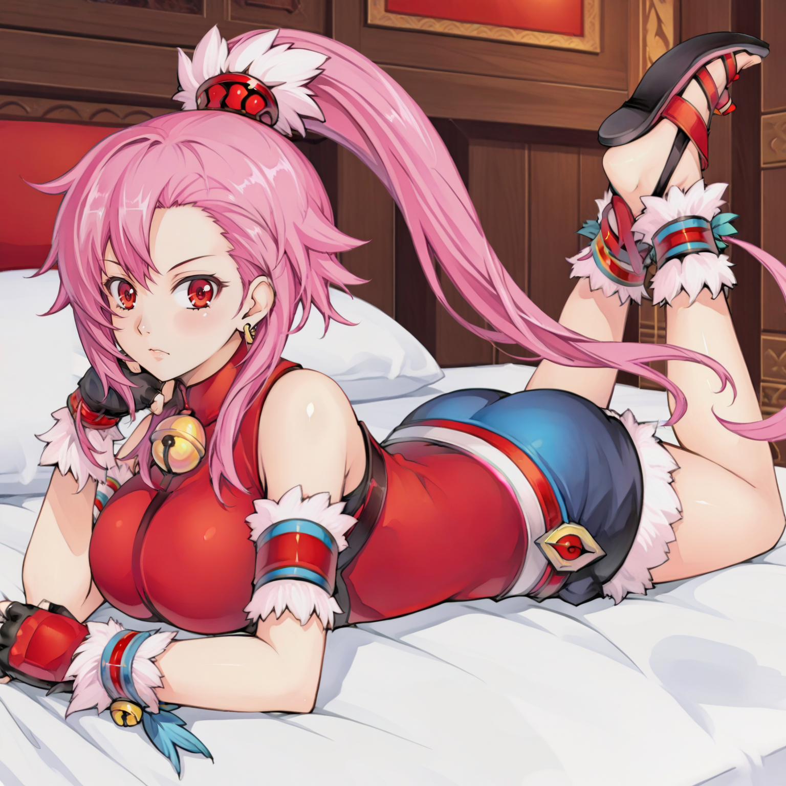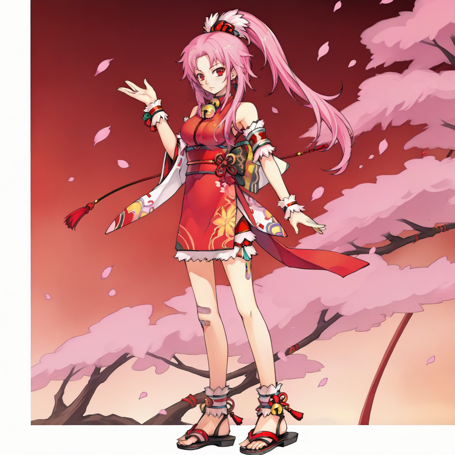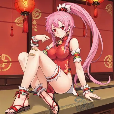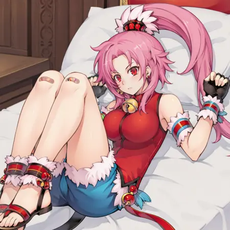| 학습된 단어 | Etward, red eyes, long hair, pink hair, ponytail, hair ornament, earrings, big breasts, 복사됨! neck bell, bare shoulders, fur trim, wrist bands, ankle bands, sleeveless dress, armband, blue shorts, sandals, fingerless gloves, bandaid on knee, 복사됨! |