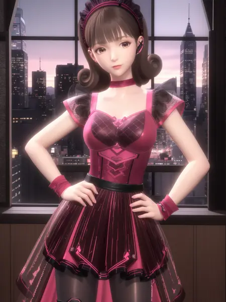 - SYNNliexinzhiling, 1girl, solo, brown hair, dress,hairband, pantyhose, brown eyes, choker,short hair,wrist cuffs,boots,cityscape,night,indoors, window, hand on hip, see-through, looking at viewer, curly hair,