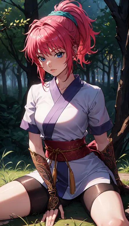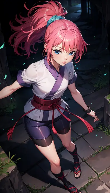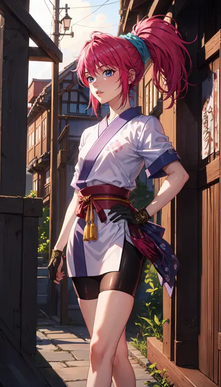 粉发,马尾辫,蓝色发带,刘海,蓝眼睛,日本服饰,短和服,无指手套,黑色骑行短裤