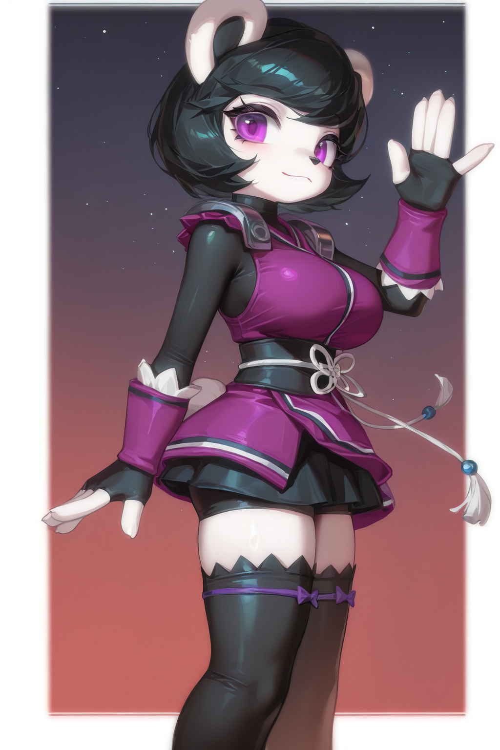 도움이 되는 설명: 보라색 소매, 검은 손가락 없는 장갑, 밥컷, 로브 아래의 검은 바디수트