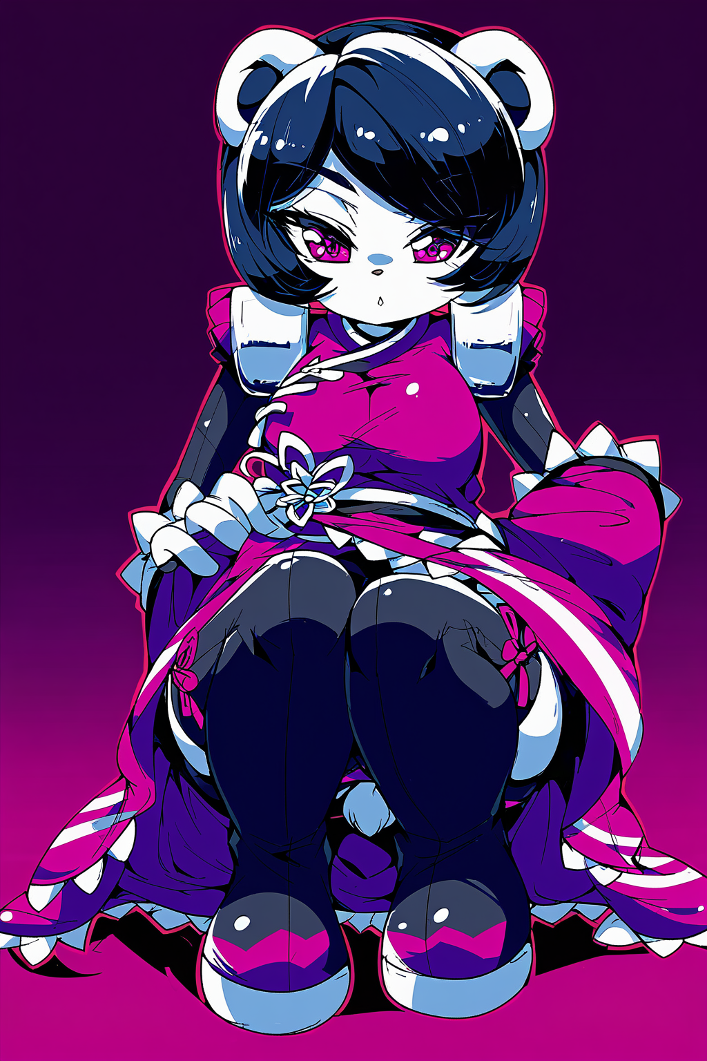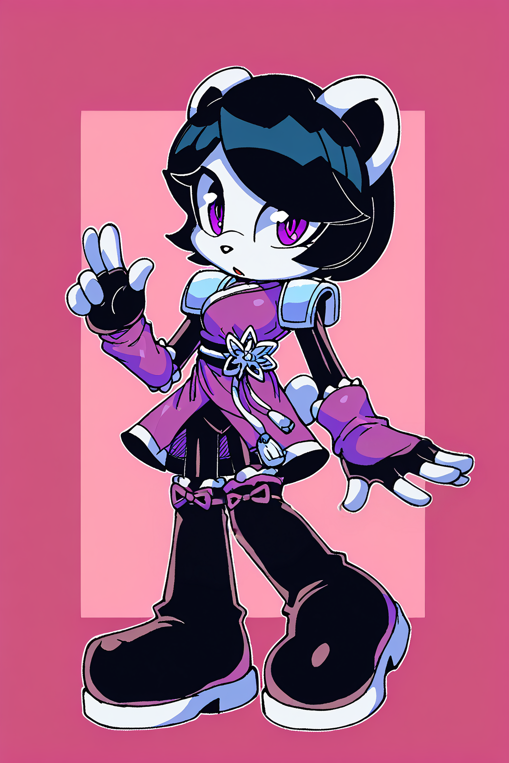 For the clothes: black knee-high boots, purple robe with black and white straps, brocade knot, black skirt underneath robe, silver shoulder pads with purple accents,