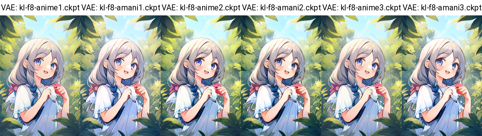 mse840000_klf8animeというVAE類とほぼ同じ配合でkl-f8-anime3を使用したものになっています。mse840000_klf8anime.vae.ptやmse840000_klf8anime_klf8anime2.vae.ptと似ていますが、多少異なります。