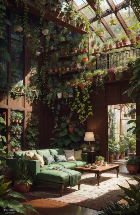 "Architectural digest photo of a maximalist green solar living room with lots of flowers and plants, golden light, hyperrealistic surrealism, award winning masterpiece with incredible details, epic stunning pink surrounding and round corners, big windows"