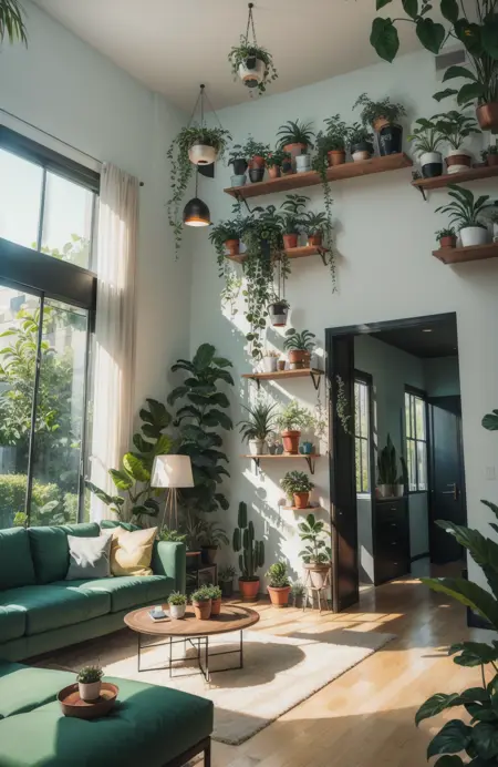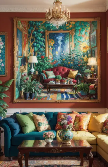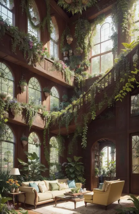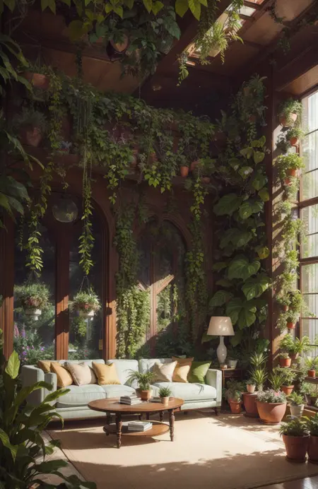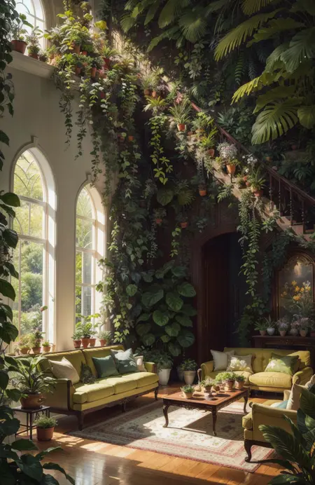 "Architectural digest photo of a maximalist green solar living room with lots of flowers and plants, golden light, hyperrealistic surrealism, award winning masterpiece with incredible details, epic stunning pink surrounding and round corners, big windows"