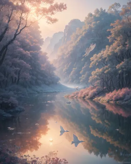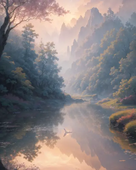 Prompt 1: A majestic 8K landscape of a forest in full bloom, with vivid and bright colors, featuring a small stream that flows peacefully through the center of the scene. (Photorealistic:1.3), (Vivid:1.4), (Highly Detailed:1.2), art inspired by Maxfield Parrish and Thomas Kinkade.