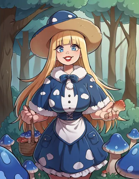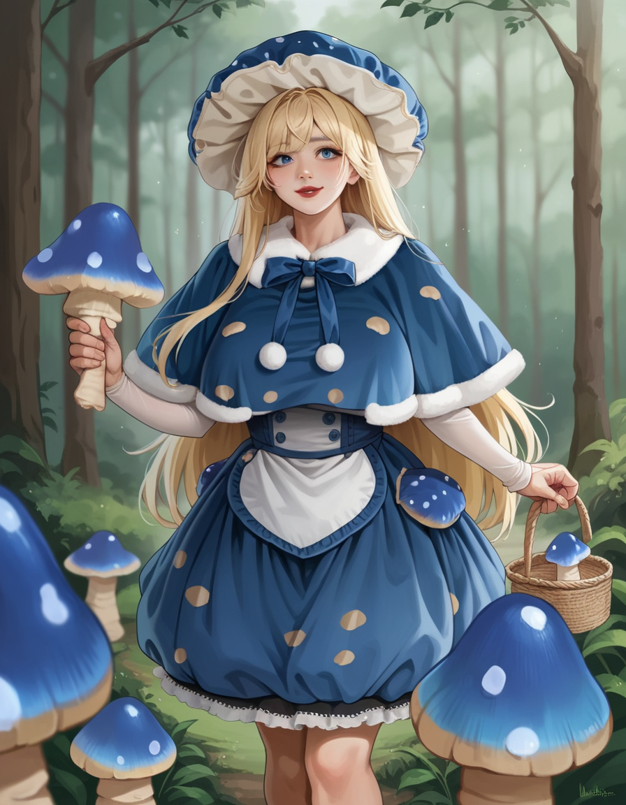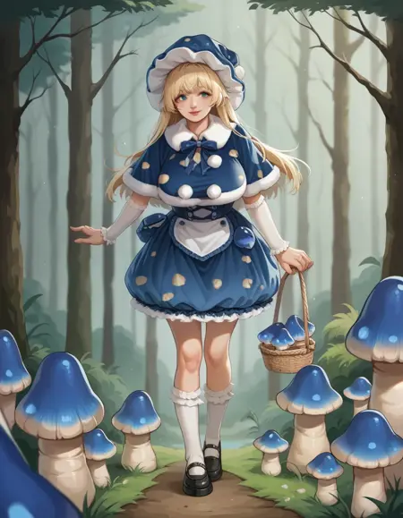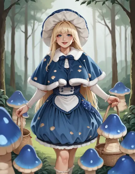 키워드: hud_mshrm_drss, 파란 버섯 모자, 드레스, 파란 드레스, 폼폼(의상), 파랑 및 흰색 털 테두리가 있는 작은 망토, 버섯