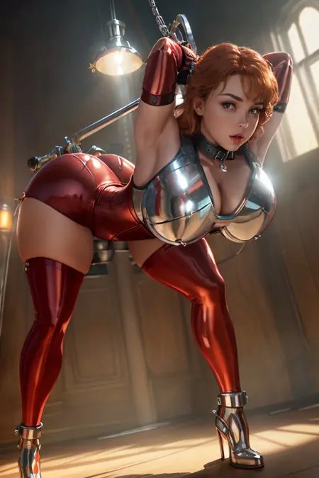 이 모델은 금속 또는 가죽, 라텍스 복장과 함께 하네스, 목걸이, 손목찌개 등 다양한 재질로 구속을 스타일라이징하며, 일부 기계 및 구속 장치도 포함합니다.
