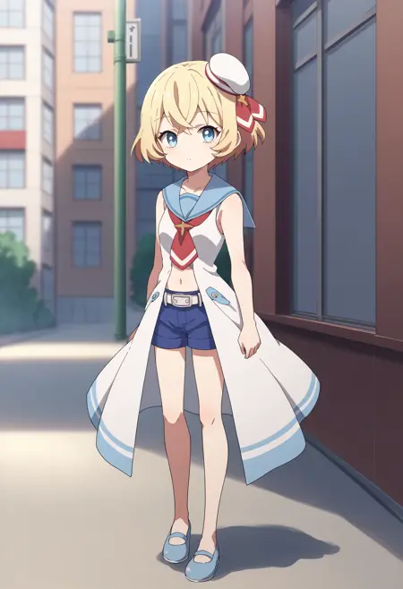 복장 프롬프트: white dress, belt, mini white hat, navel, sailor collar, blue shorts, sleeveless shirt
