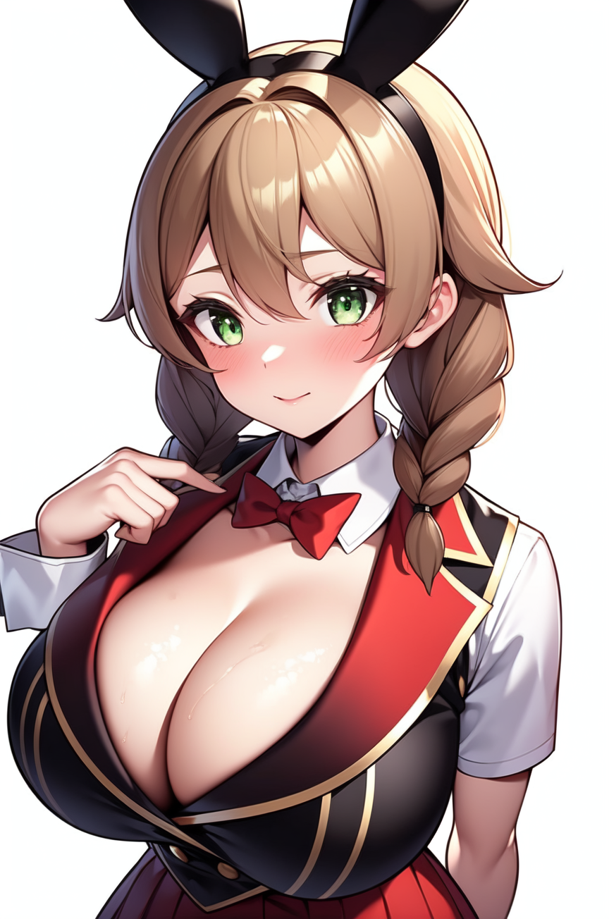 kana_(bunny_garden),braid,brown_hair,cleavage,green_eyes,large_breasts,long_hair,twin_braids,