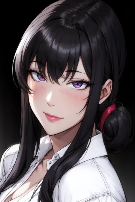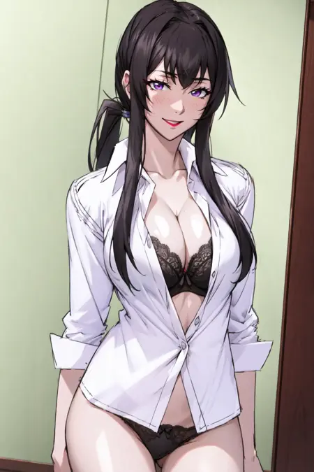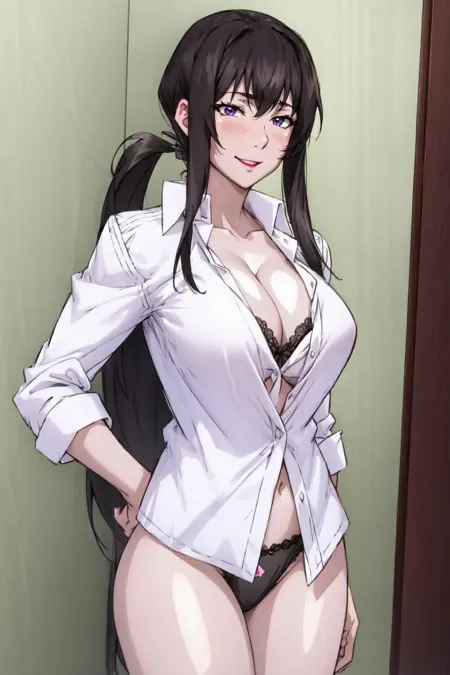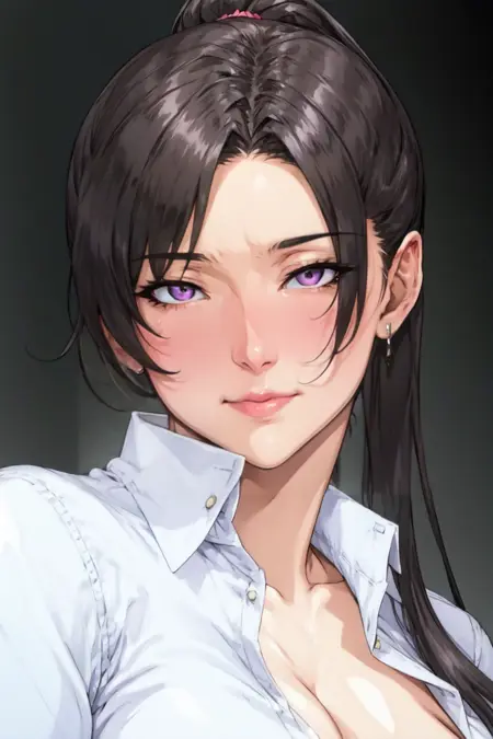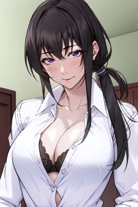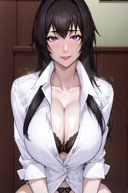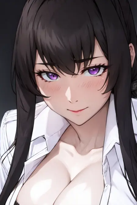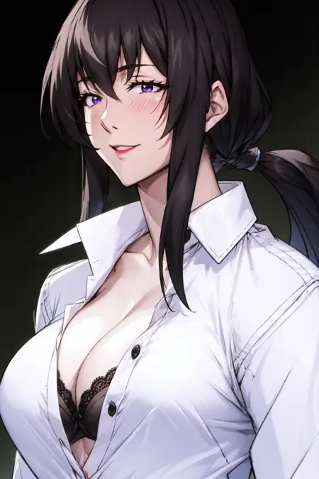 long hair, ponytail, black hair, purple eyes, lipstick, large breasts
