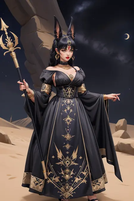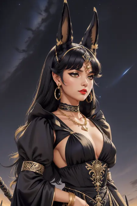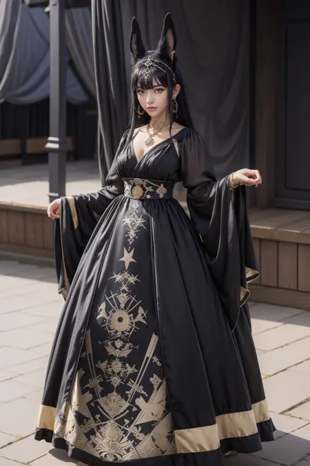키워드: hud_anubis_drss, 긴 드레스, 금장식이 있는 검은 드레스, (검은 동물 귀), 귀걸이, 팔찌, 목걸이, 금제 관모, 긴 소매, 풍선 소매