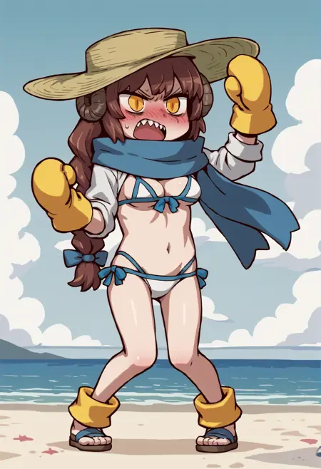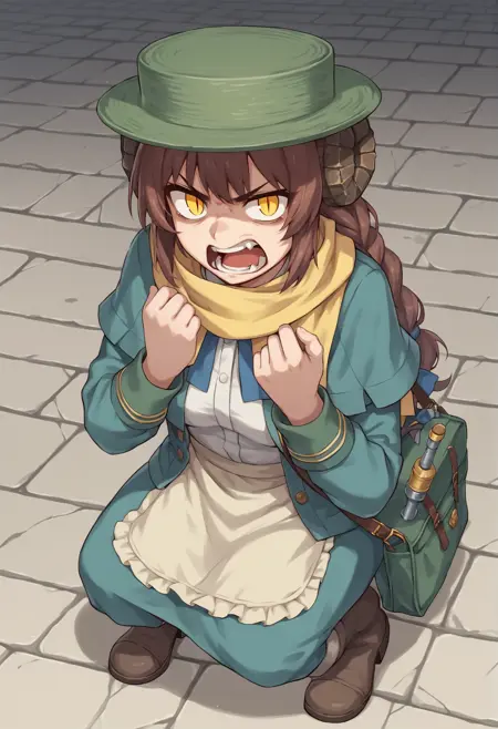 주요 태그: 갈색 머리, 노랑 눈, 수직 동공, 긴 머리, 땋은 머리, 뿔, 흰 셔츠, 리본, 모자, 스카프, 장갑, 카프레트, 녹색 재킷, 녹색 치마, 앞치마, 가방, 부츠,