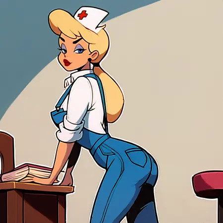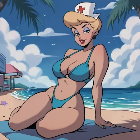 Added tags: Eyeshadow, Teal eyes, blue eyes, blonde hair, hellonurse, nurse cap, nurse clothing, lipstick,