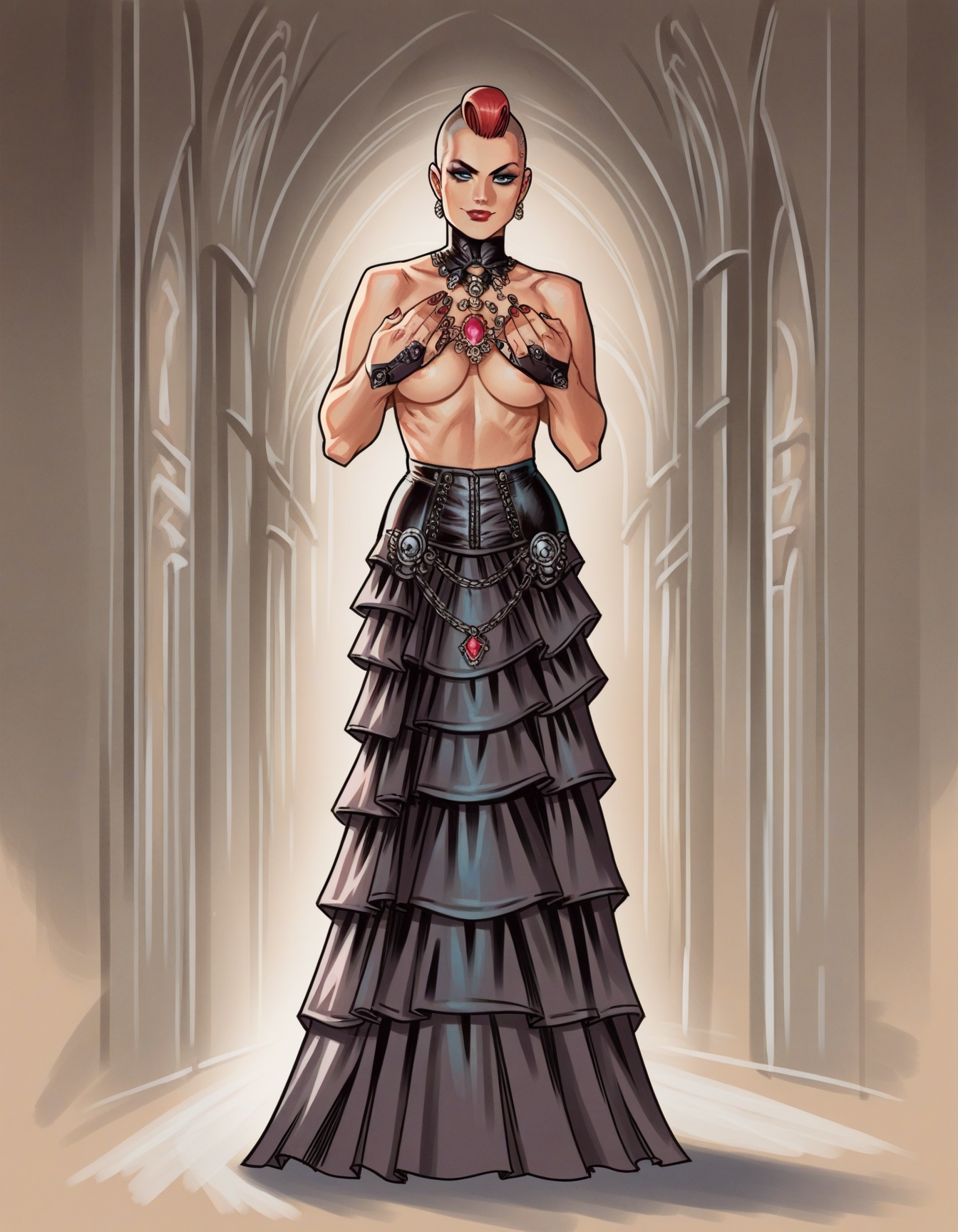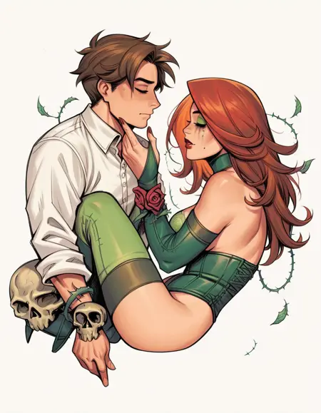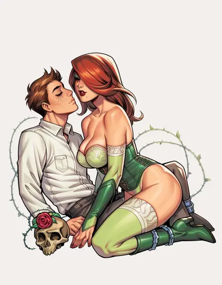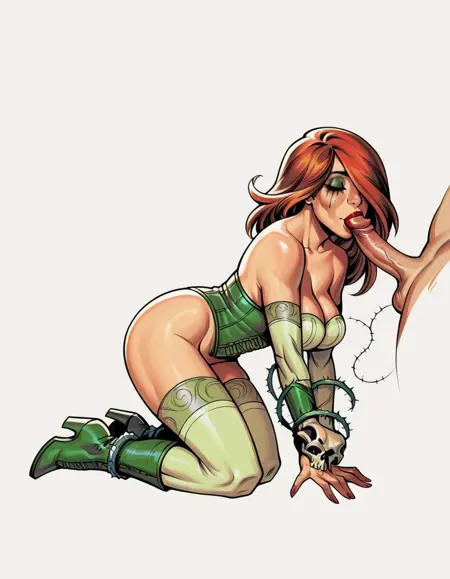 Dawn 캐릭터 키워드: hud_jml_styl, full body, 1girl, large breasts, makeup, lipstick, red hair over one eye, mascara tears under right eye, green eyes, green lingerie, thighhighs, corset, green boots, skull, rose on arm, thorns, vines, sketch