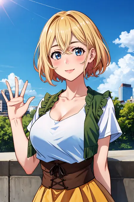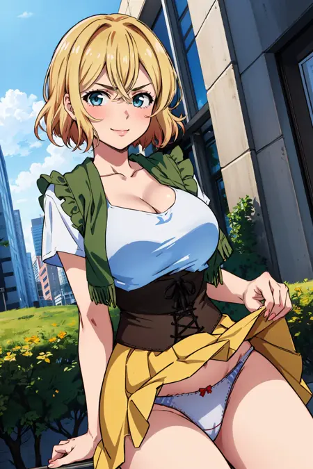 Add "white t-shirt, green vest, frills, short sleeves, corset, yellow skirt, cleavage, large breasts" for her vest.