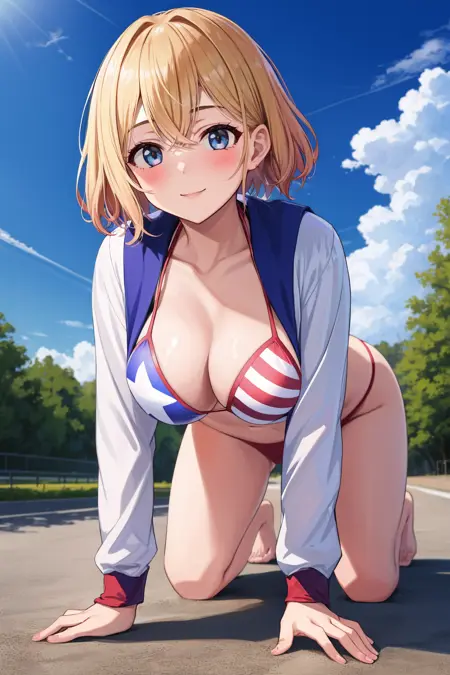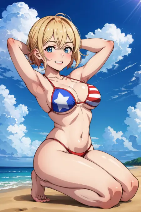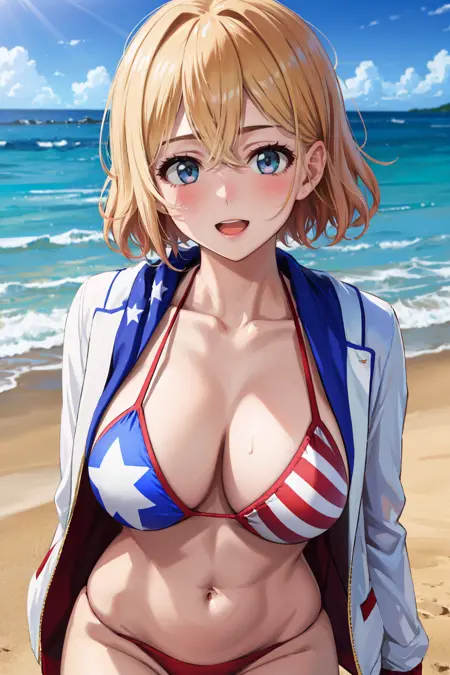Add "american flag bikini, white jacket, red bikini bottom" for her bikini.