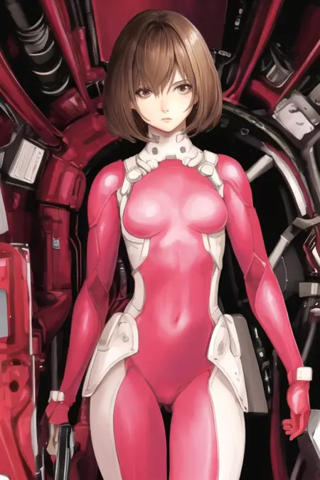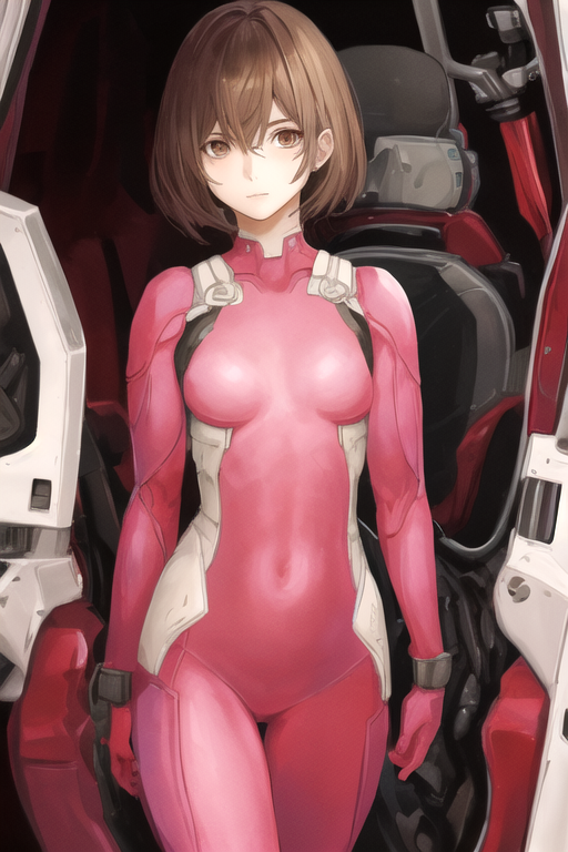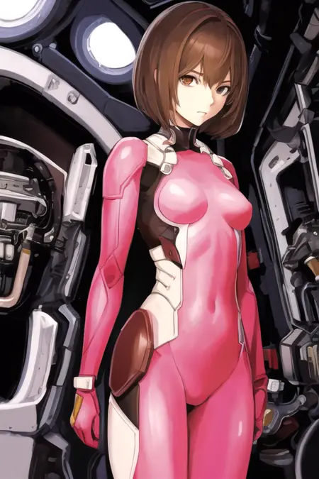 RitaVrataski, 1girl, solo, short hair, brown hair, brown eyes, medium breasts, pink bodysuit, skin tight, science fiction, pilot suit,