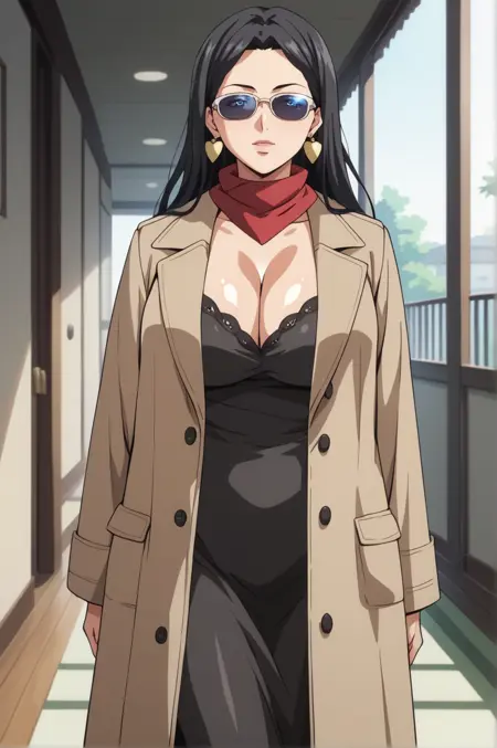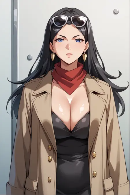 long hair, black hair, blue eyes, large breasts, jewelry, earringsAttire