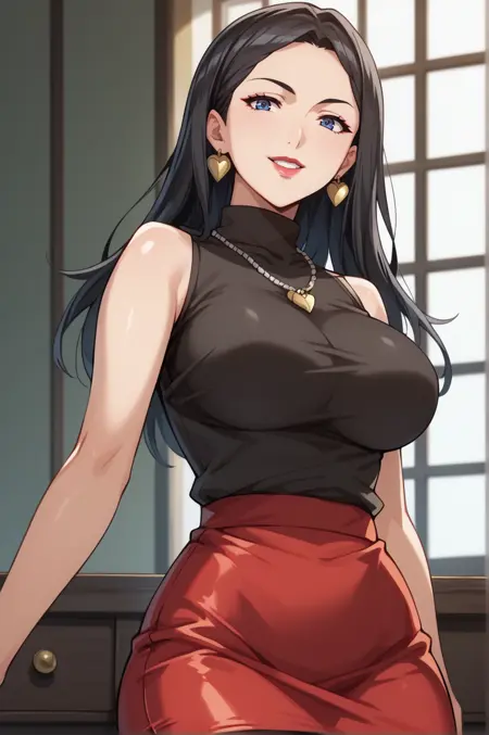 bare shoulders, sleeveless, black turtleneck, red skirt, necklace, pencil skirt