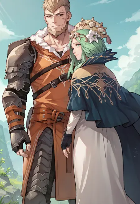 - Default appearance: jeraltFE, short hair, undercut, beard, armor, gloves, fur trim, shoulder armor, fingerless gloves, scar on face, boots