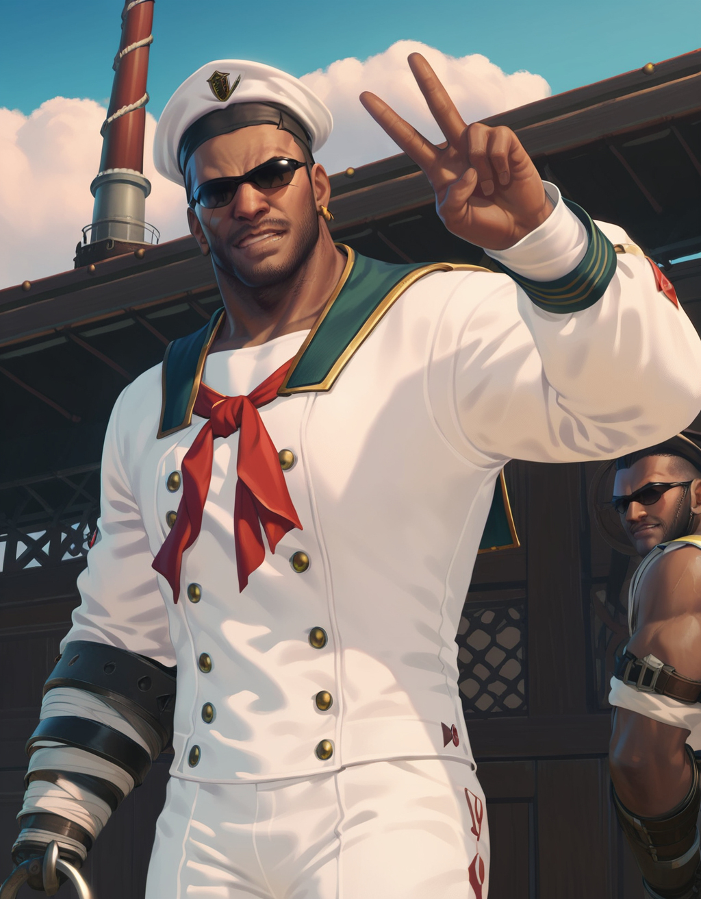 태그: 바렛, 검은 피부 남성, 총 팔, 해군 복장, 팔 대신 갈고리, 선글라스