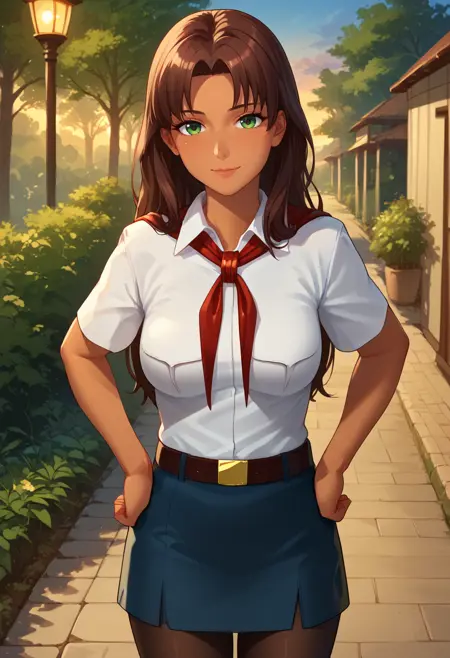 olga, green eyes, brown hair, long hair, 1girl, solo, lips, mature, fit body, skinny, medium breasts、ネガティブプロンプトには big breasts