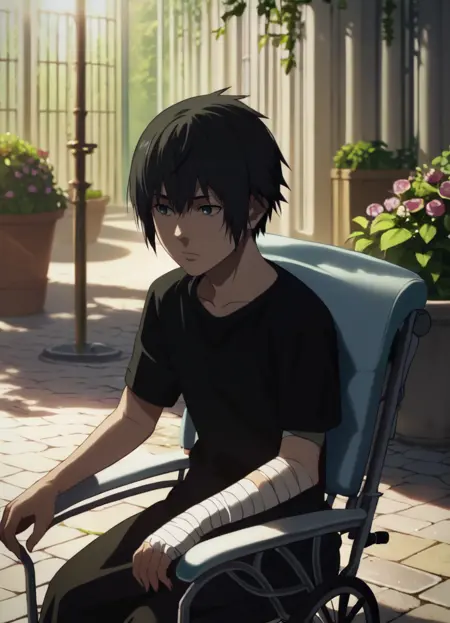 noctisyoung, 1boy, young, black shirt, wheelchair, bandages, sitting