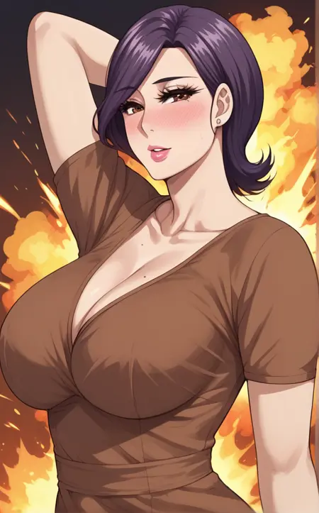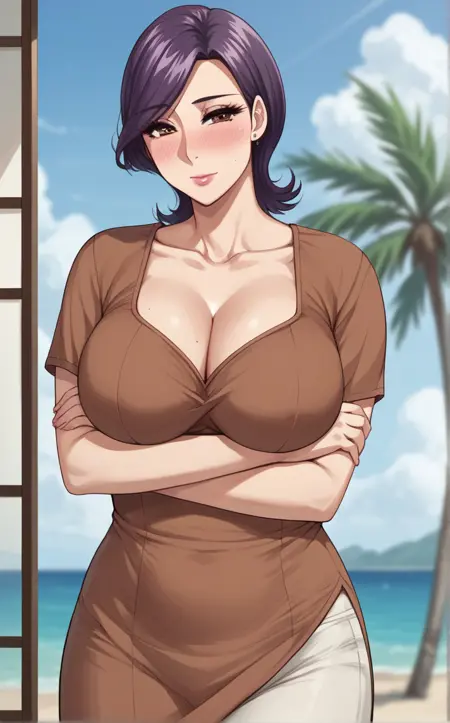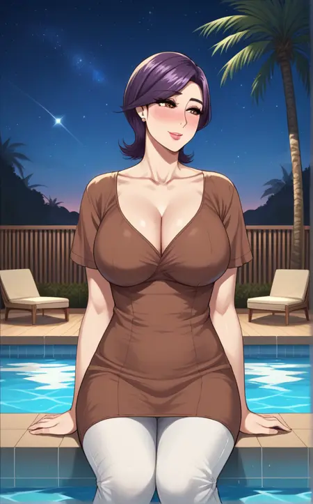 BrownDress_Minako_ownwaifu, 1girl, brown eyes, eyelashes, lips, mature female, purple hair, short hair, swept bangs, stud earrings, brown dress, lipstick, makeup, jewelry, collarbone, large breasts, pink lips, short sleeves, cleavage, nose blush, v-neck, white pants,