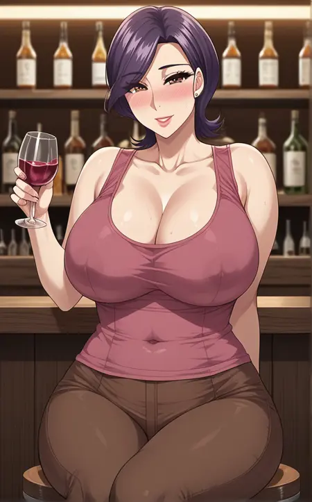 TankTopPink_Minako_ownwaifu, 1girl, brown eyes, eyelashes, lips, mature female, purple hair, short hair, stud earrings, swept bangs, pink tank top, bare shoulders, brown pants, tank top, tight clothes, jewelry, collarbone, lipstick, large breasts, nose blush, makeup, sleeveless, covered navel, cleavage, curvy, huge breasts, impossible clothes, eyes visible through hair, hair behind ear, impossible dress, wide hips,