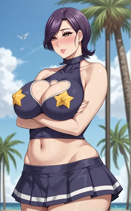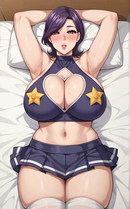 Cheerleader_Minako_ownwaifu, 1girl, brown eyes, eyelashes, lips, mature female, purple hair, cheerleader, cleavage cutout, pleated skirt, purple skirt, purple tank top, short hair, star pasties, stud earrings, swept bangs, turtleneck, white thighhighs, zettai ryouiki, bare shoulders, clothing cutout, large breasts, star (symbol), midriff, lipstick, sleeveless, makeup, navel, heart cutout, miniskirt, halterneck, choker, collarbone, nose blush, sleeveless turtleneck, star print, huge breasts, thighs, belly, hair over eyes, thick thighs, bright pupils, cleavage, hair behind ear, microskirt, pink lips, skindentation,