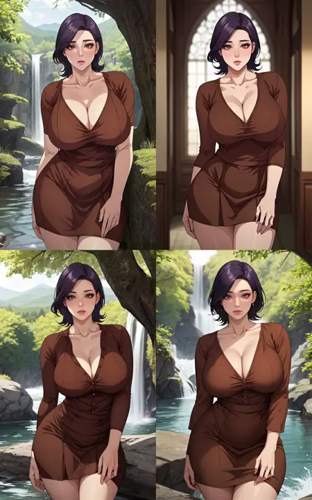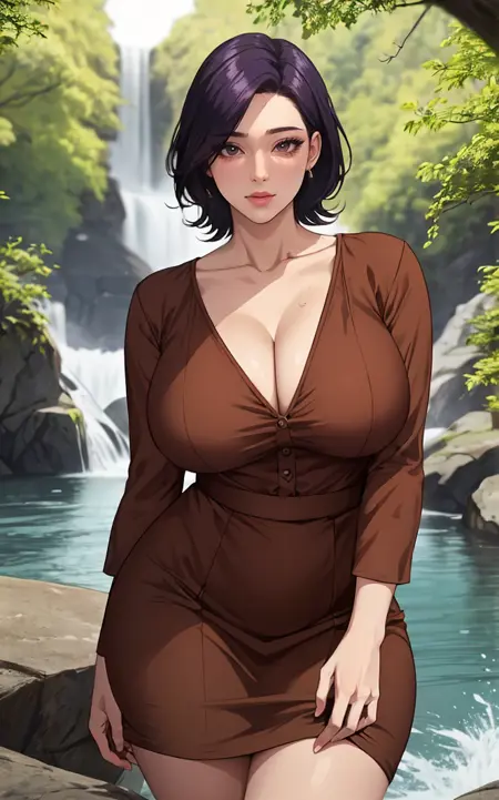 BrownDress_Minako_ownwaifu, 1girl, brown eyes, eyelashes, lips, mature female, purple hair, short hair, swept bangs, stud earrings, brown dress, lipstick, makeup, jewelry, collarbone, large breasts, pink lips, short sleeves, cleavage, nose blush, v-neck, white pants,