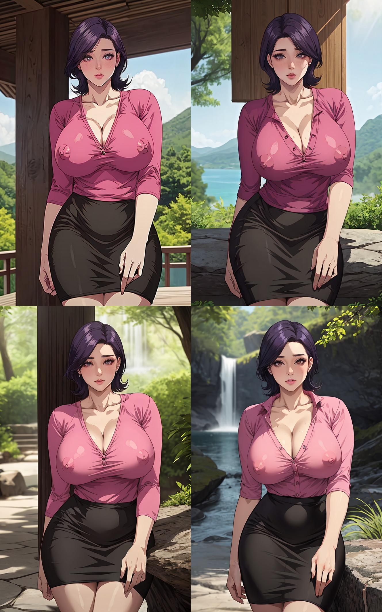 Skirt_Minako_ownwaifu, 1girl, brown eyes, eyelashes, lips, mature female, purple hair, pencil skirt, pink shirt, black skirt, short hair, stud earrings, swept bangs, collarbone, jewelry, large breasts, lipstick, cleavage, makeup, pink lips, scoop neck, v-neck, hair over eyes, curvy, long sleeves, nose blush, impossible clothes, pantylines,