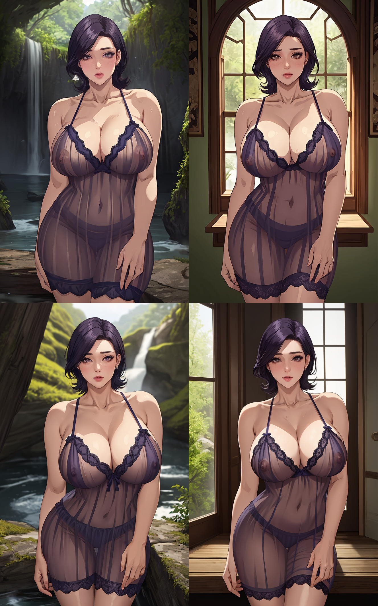 NightGown_Minako_ownwaifu, 1girl, brown eyes, eyelashes, lips, mature female, purple hair, purple nightgown, highleg panties, purple panties, see-through, short hair, stud earrings, swept bangs, cleavage, large breasts, underwear, collarbone, nightgown, bare shoulders, lingerie, jewelry, negligee, chemise, hair behind ear, nipples, camisole, curvy, spaghetti strap, thick thighs, wide hips, lipstick, makeup,
