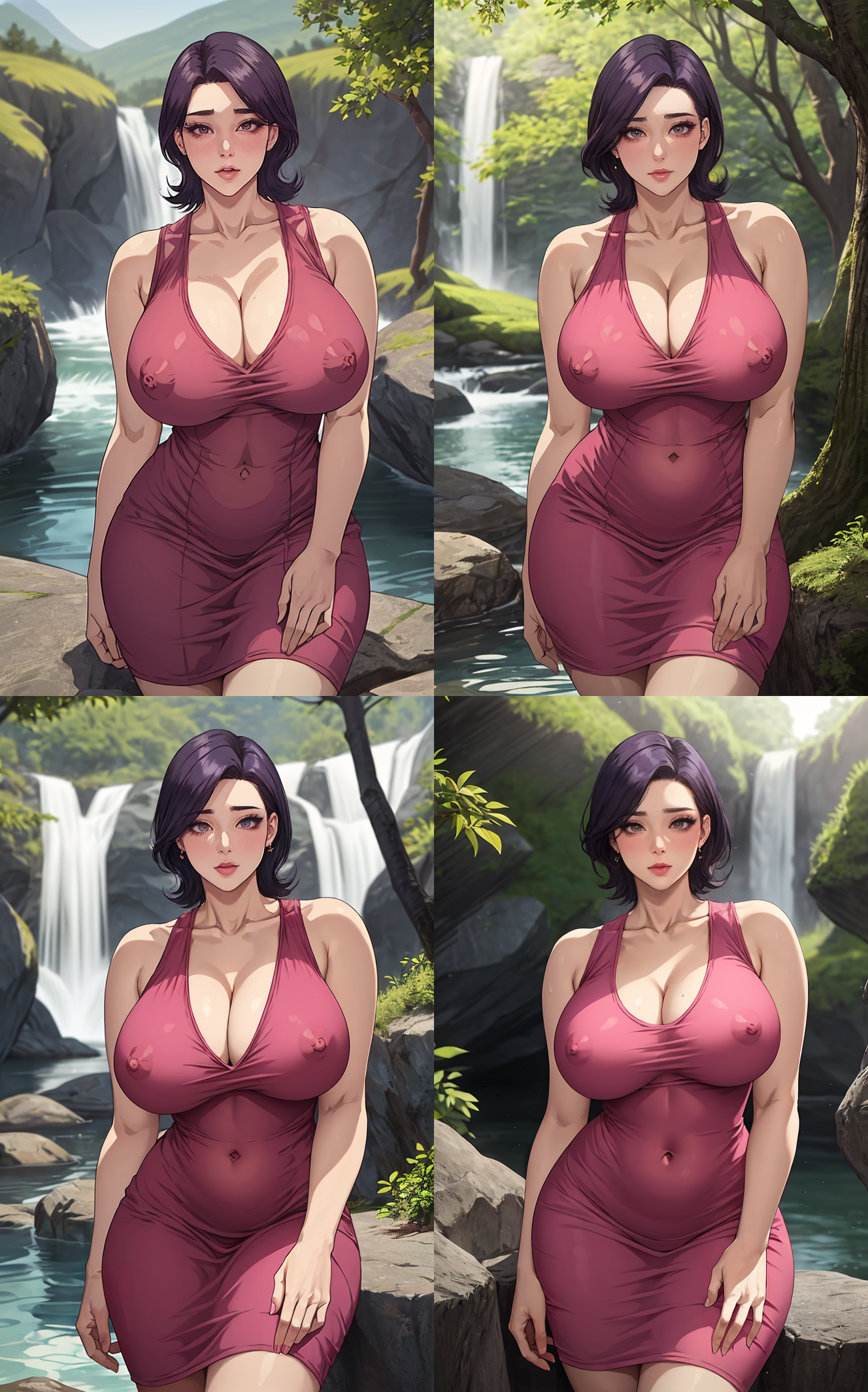 NSFW_Minako_ownwaifu, 1girl, brown eyes, eyelashes, lips, mature female, purple hair, short hair, stud earrings, swept bangs, jewelry, large breasts, nude, nipples, puffy nipples, lipstick, pussy, completely nude, makeup, nose blush, huge breasts, curvy, large areolae, thick thighs, wide hips, pink lips,