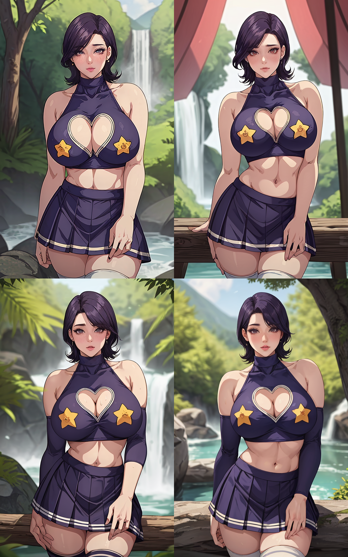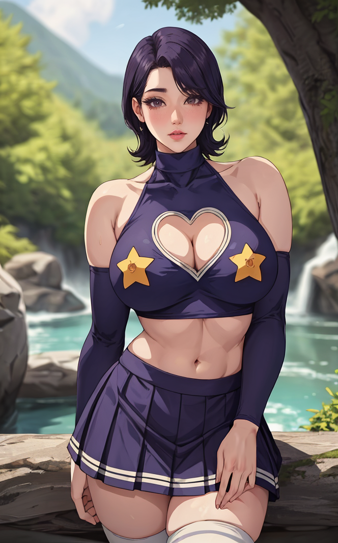 Cheerleader_Minako_ownwaifu, 1girl, brown eyes, eyelashes, lips, mature female, purple hair, cheerleader, cleavage cutout, pleated skirt, purple skirt, purple tank top, short hair, star pasties, stud earrings, swept bangs, turtleneck, white thighhighs, zettai ryouiki, bare shoulders, clothing cutout, large breasts, star (symbol), midriff, lipstick, sleeveless, makeup, navel, heart cutout, miniskirt, halterneck, choker, collarbone, nose blush, sleeveless turtleneck, star print, huge breasts, thighs, belly, hair over eyes, thick thighs, bright pupils, cleavage, hair behind ear, microskirt, pink lips, skindentation,