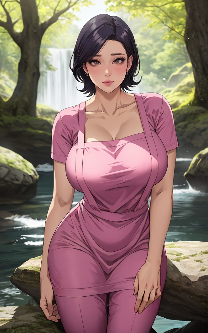 Apron_Minako_ownwaifu, 1girl, brown eyes, eyelashes, lips, mature female, purple hair, short hair, stud earrings, swept bangs, pink shirt, apron, black skirt, lipstick, makeup, collarbone, jewelry, pink lips, long sleeves, huge breasts, large breasts, pantylines,