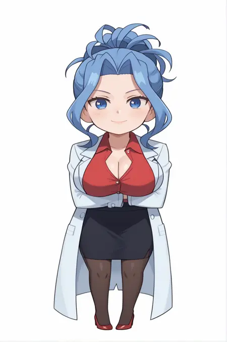 white labcoat, red shirt, cleavage, long sleeves, collared shirt, pencil skirt, black skirt, miniskirt, black thighhighs, red footwear, high heels