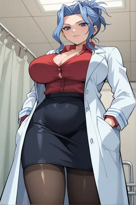 blue hair, hair up, blue eyes, cleavage, huge breastsAttire