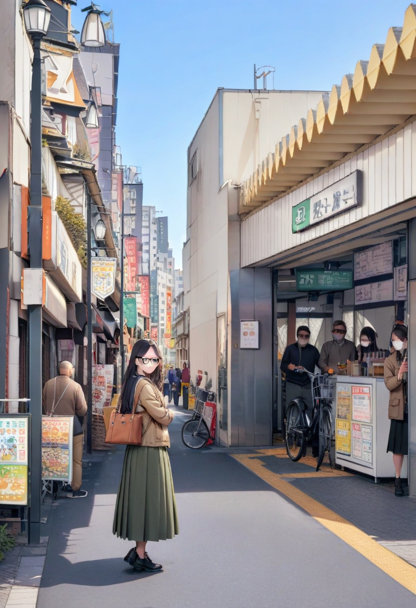 uguisudani_kitaguchi, storefront, scenery, bicycle, real world location, outdoors, street, road, sky, day, city, building, multiple boys, blue sky, 6+boys, sign, walking, lamppost