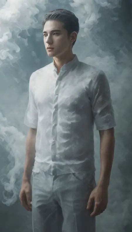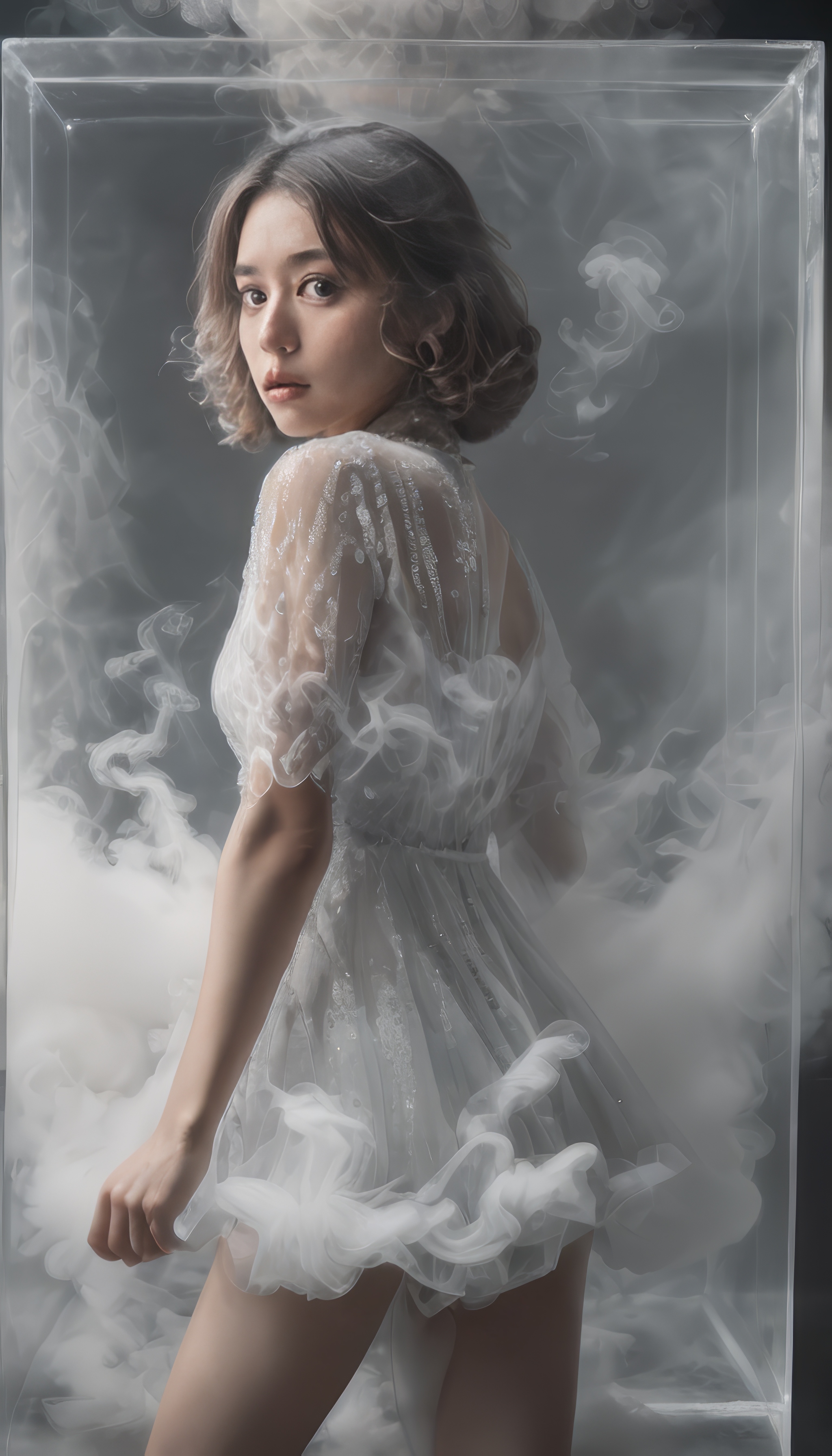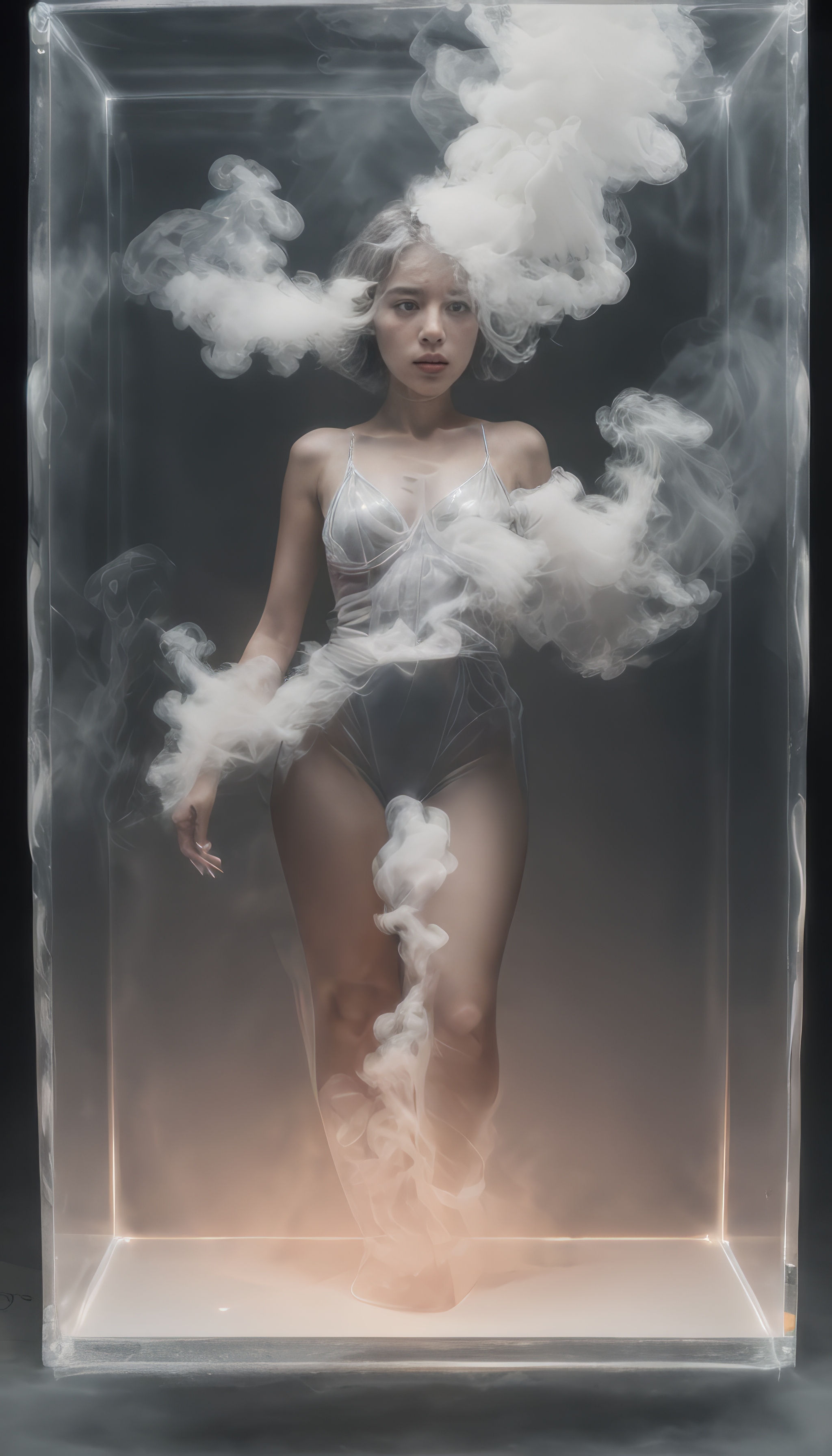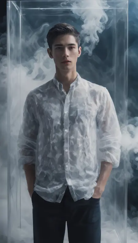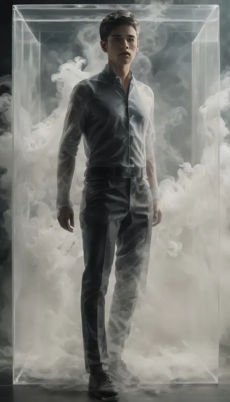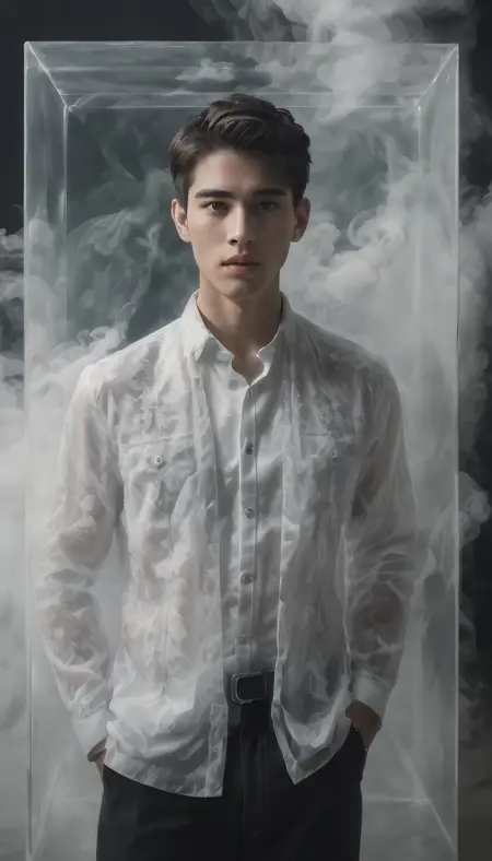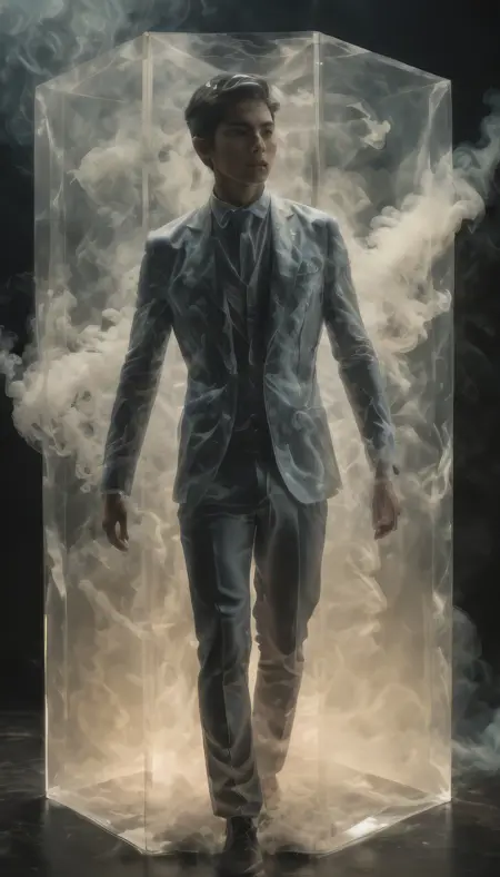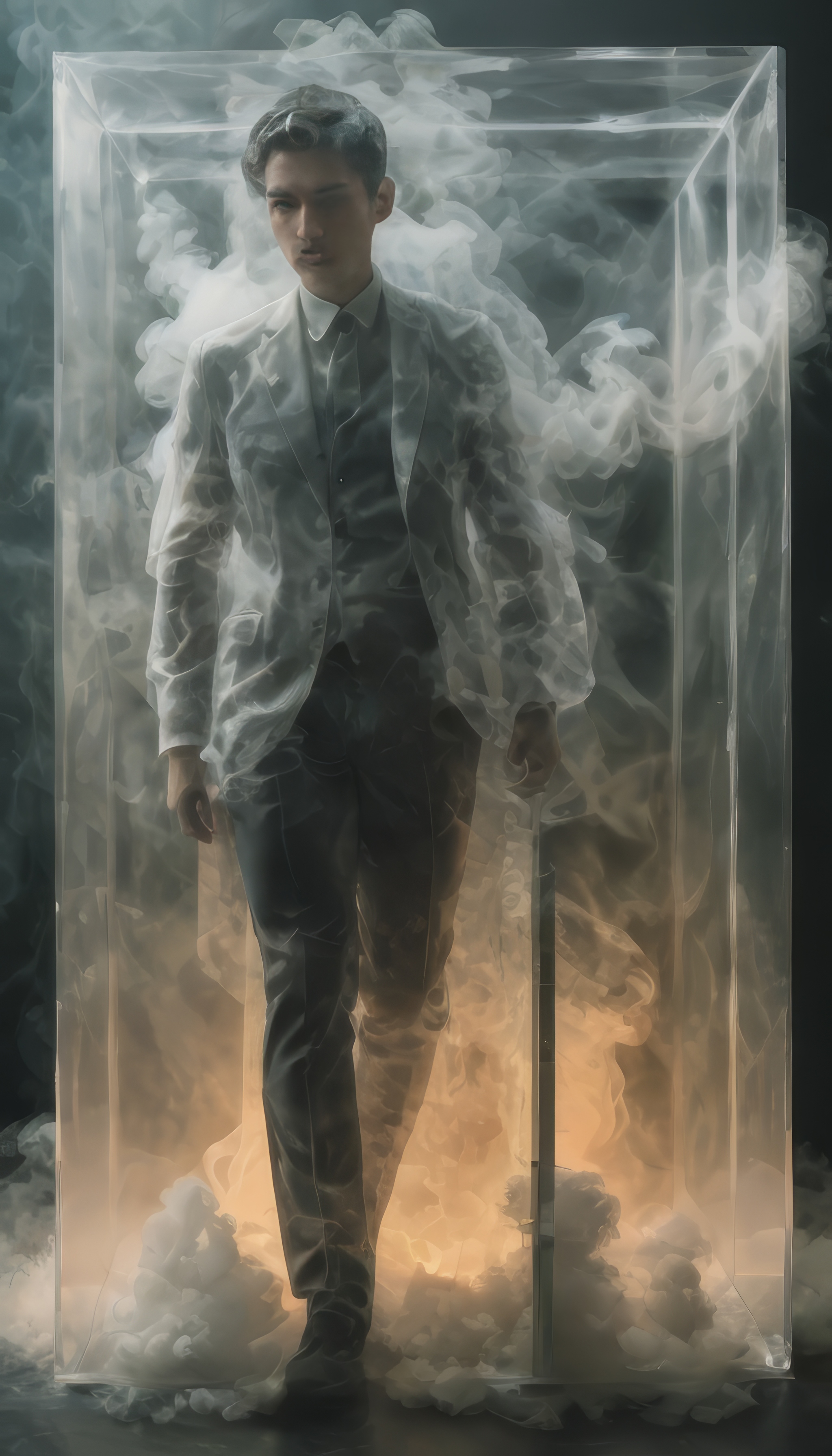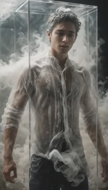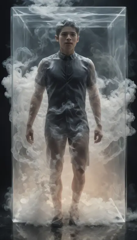 (best quality, masterpiece, Ultra Details:1.43),(high quality photography, Canon EOS R3, photorealistic,1boy,solo:1.33),male focus,transparent cube,white smoke,<lora:Moo Moo Smoke Cube V1:0.8>,mumulft,