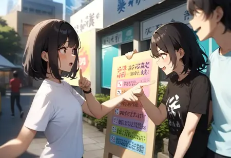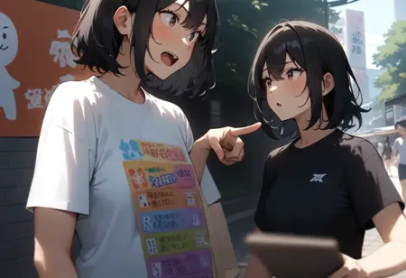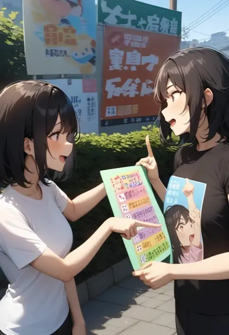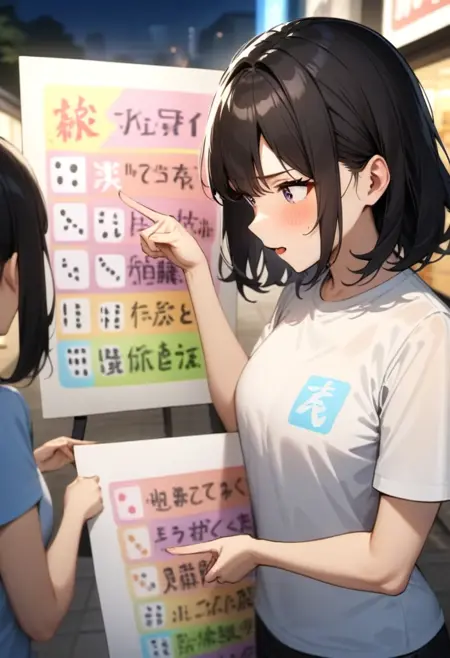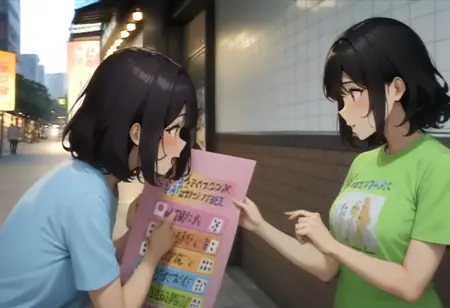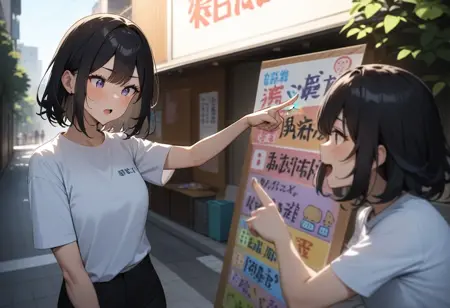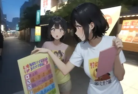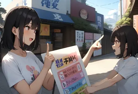 2girls, black hair, medium hair, t-shirt, shy smile, holding, (poster board), outdoors, pointing,