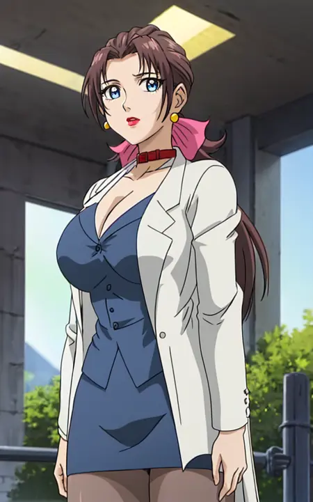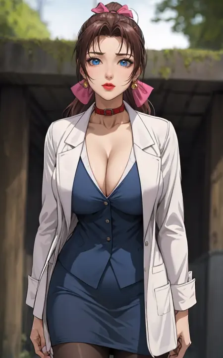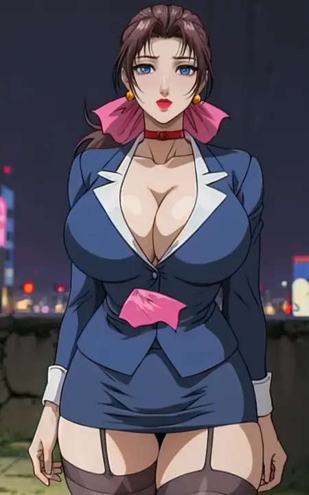 1girl, brown hair, earrings, lipstick, long hair, makeup, mature female, blue eyes, red collar, collar, large breasts, ponytail, hair bow, pink bow, red lips, hair ribbon,