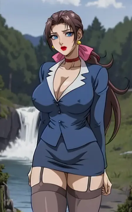 1girl, brown hair, lipstick, long hair, makeup, mature female, blue eyes, large breasts, red lips,